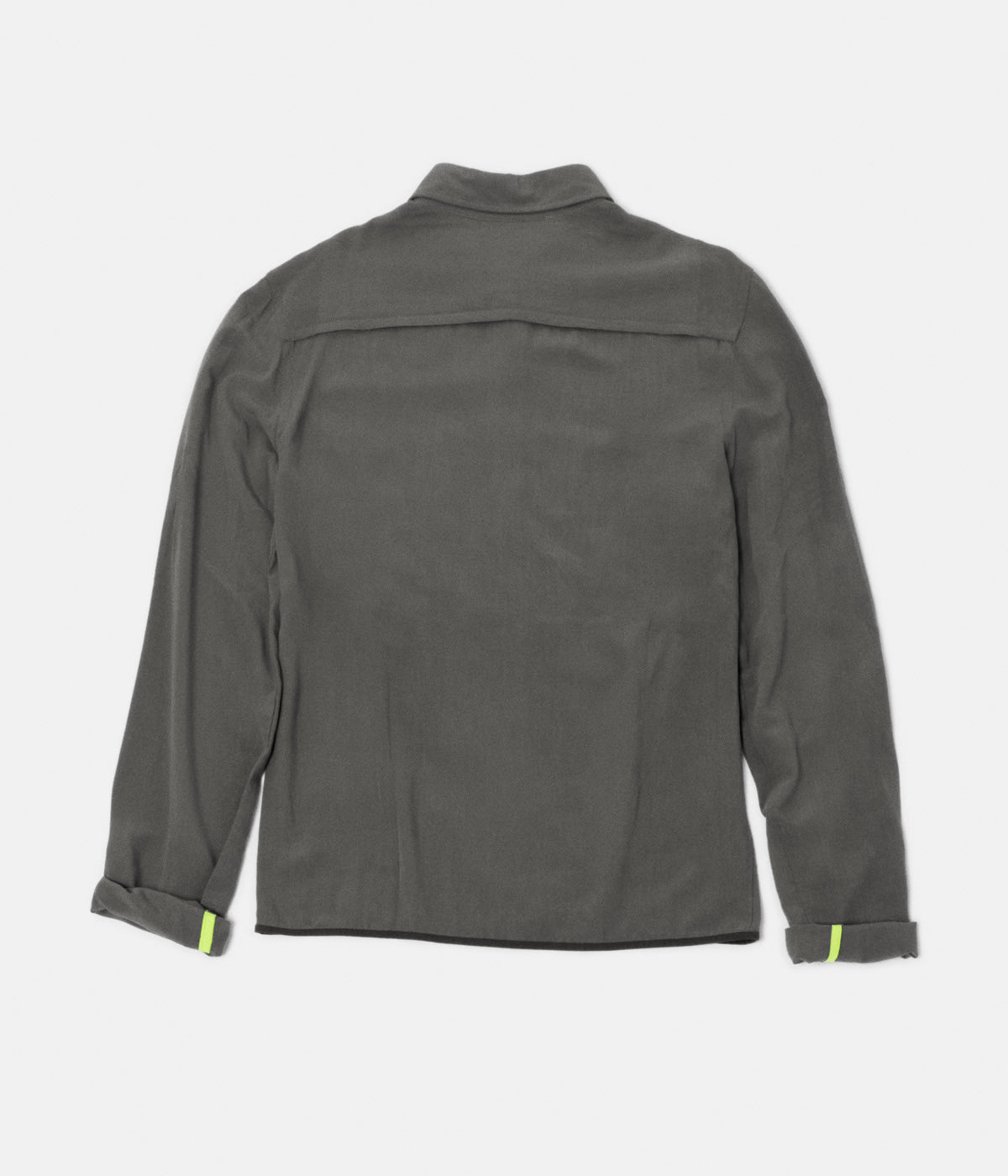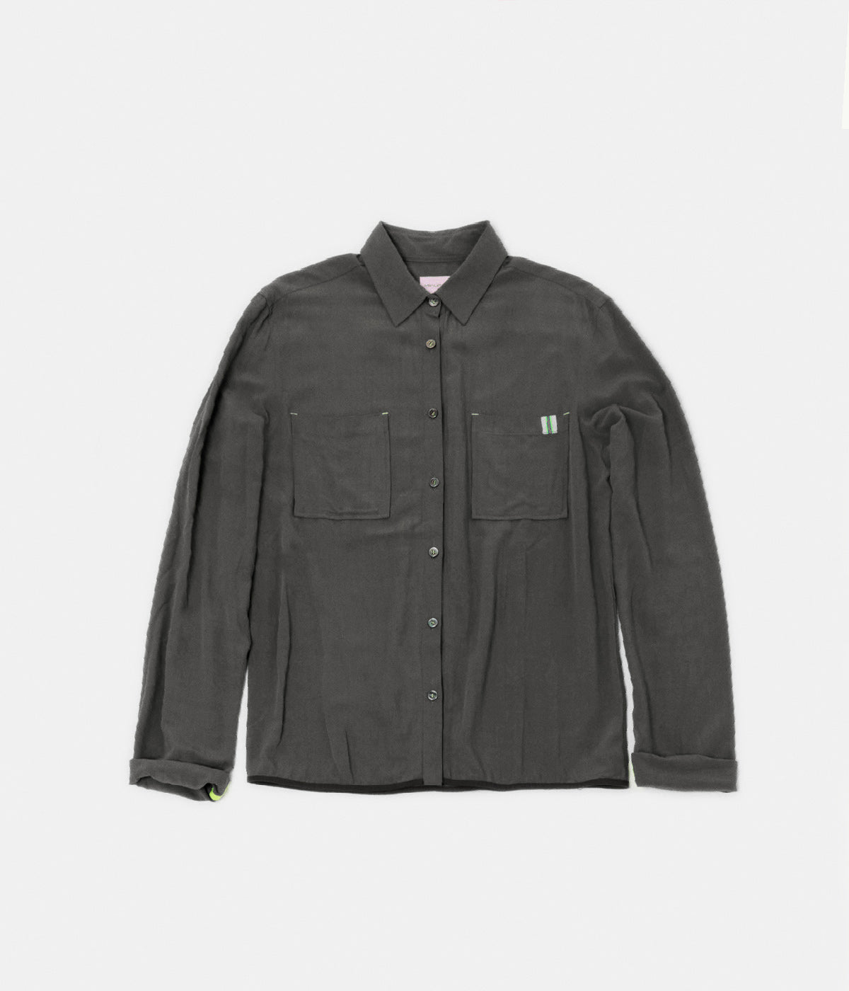 Fluid-Shirt is a loose fit top cut by Minuit Deux. The closing is made by 10mm pearl buttons and you gladly wear the shirt on your trouser as you have a bias at the bottom of the shirt. The shirt includes a Windsor collar and two front pocket on the chest line. Sleeves doesn’t have a cuff but allow you to roll it with colored ribbon detail on the inside.