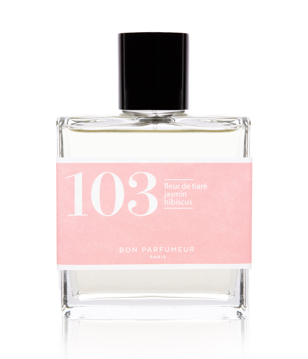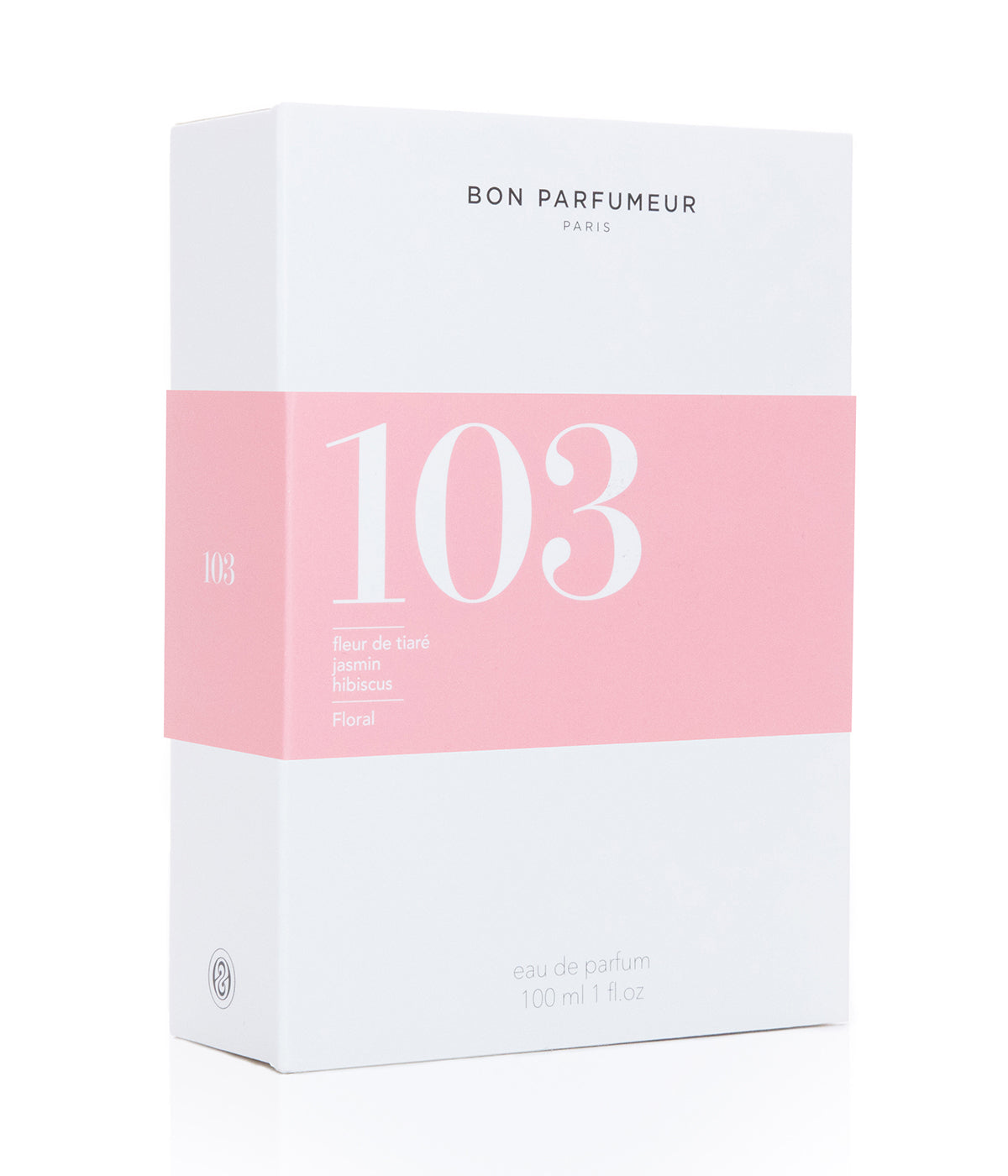 103 opens up with a light, fresh bergamot and its heart reveals its floral character, with notes of jasmine and heliotrope. A woody base reveals its milky vanilla scent, calling out to the sunny Tahitian gardenia flower..