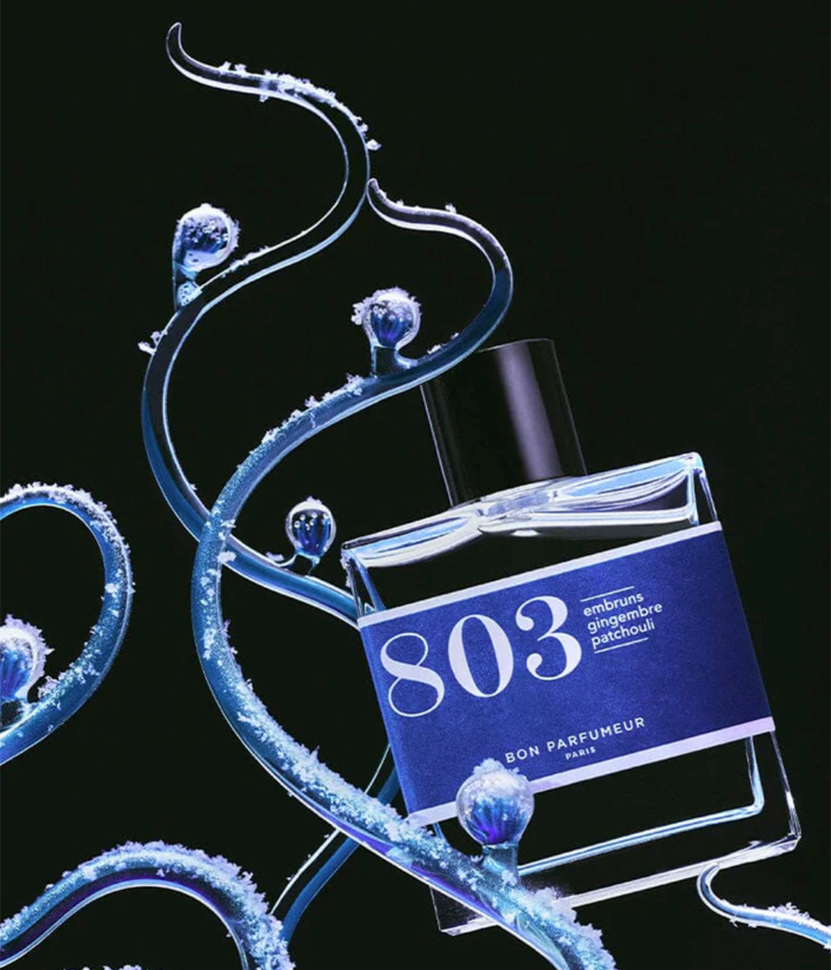 803 is a patchouli caught in ice: a true tension between hot and cold. A frost opening with marine accents, warmed by a spicy trio: ginger, pink berries and juniper. The power and intensity of warm patchouli notes in the base.