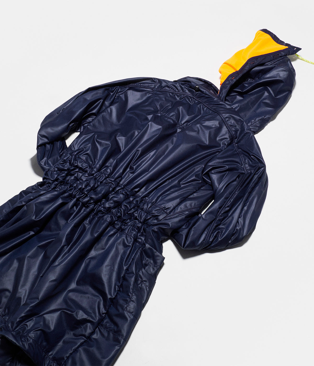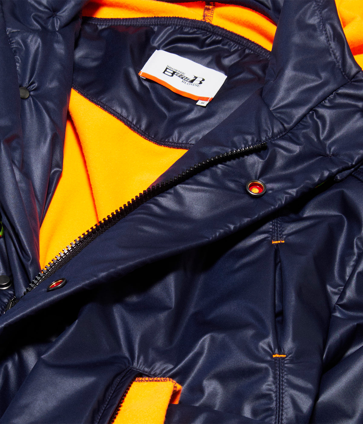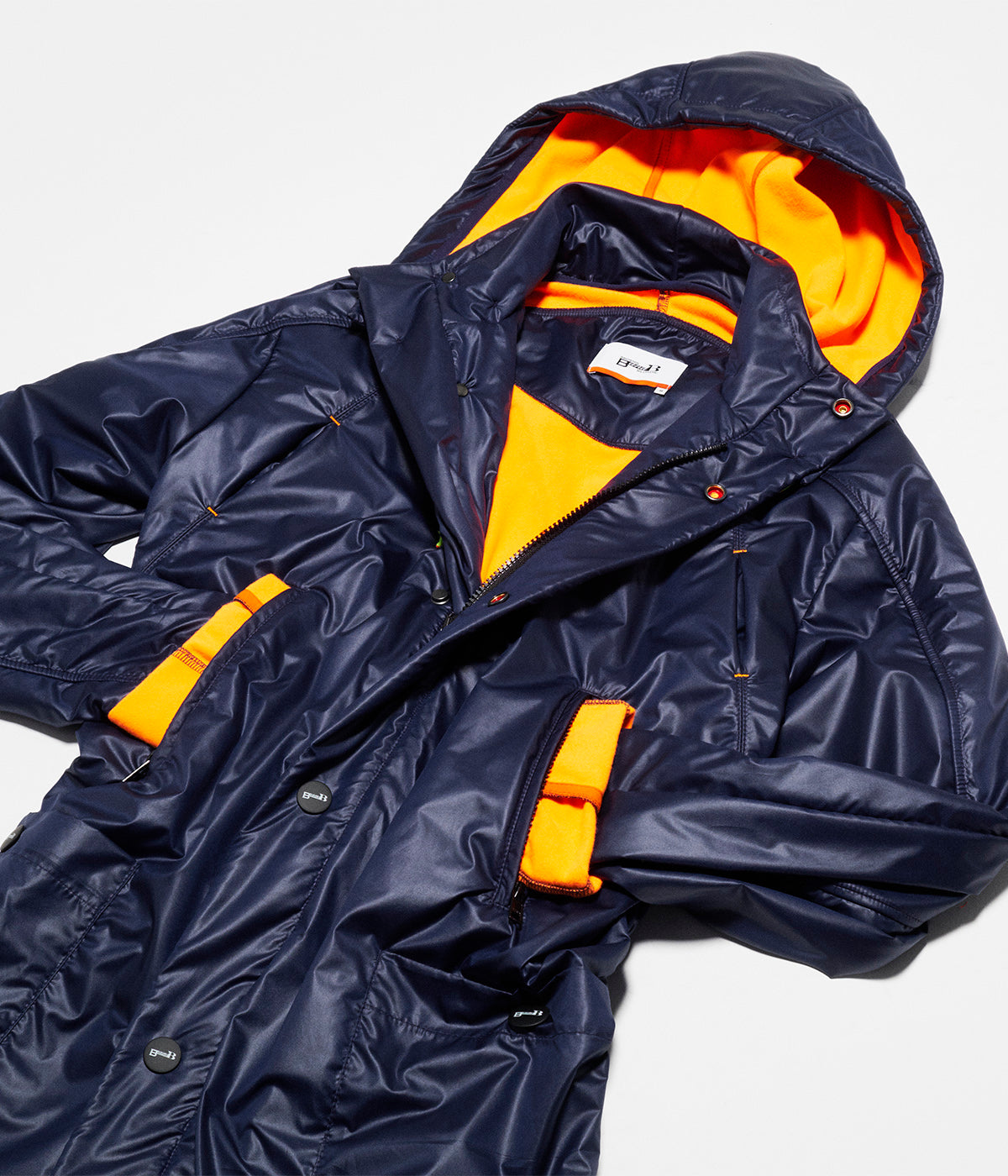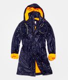 You will always find all the refined details...the double closing system : a double side opening zipper and personalized snap fasteners, the 5 different pockets : 2 zipped , 2 big flat A5 one and one for your iPhone, and the neon ribbon in the inside with which you can make the parka tighter in the back...but also, and that is the big new, a detachable hood.