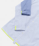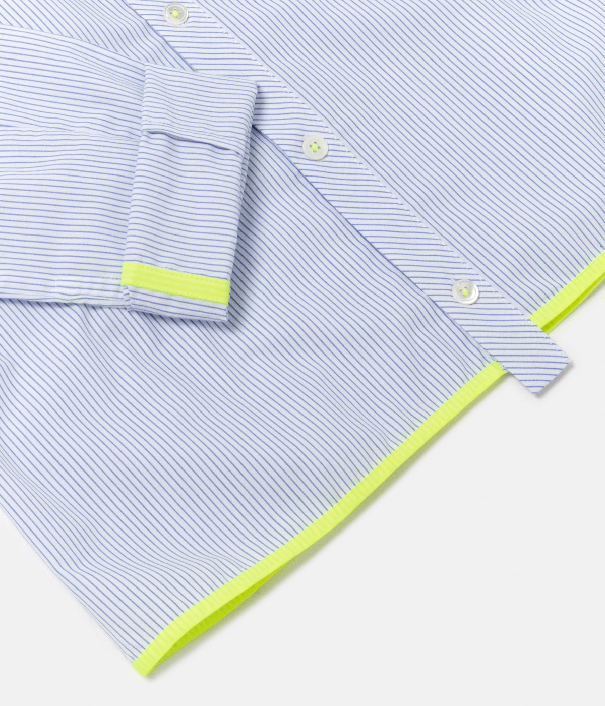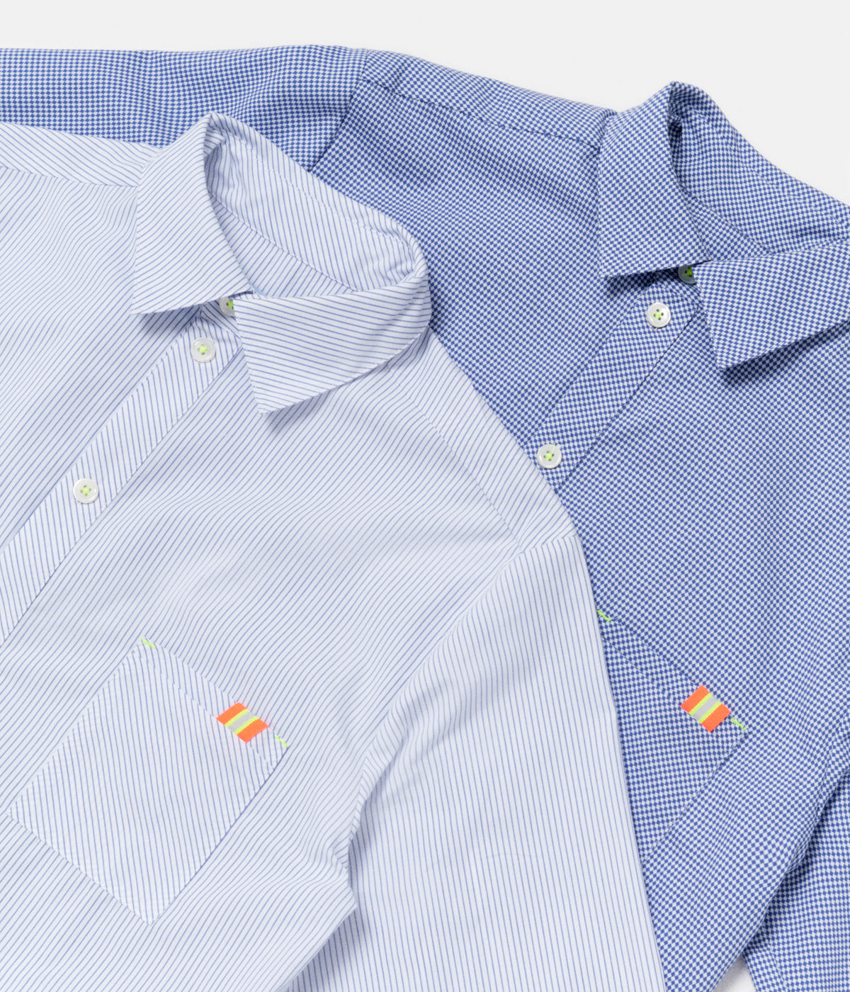 Smart-Shirt is the classic slim fitted shirt of Minuit Deux. The closing is made by 10mm pearl buttons and you gladly wear the shirt on your trouser as you have a bias at the bottom of the shirt. The shirt includes a Windsor collar and a pocket on the left side. Sleeves doesn’t have a cuff but allow you to roll it with colored ribbon detail on the inside.