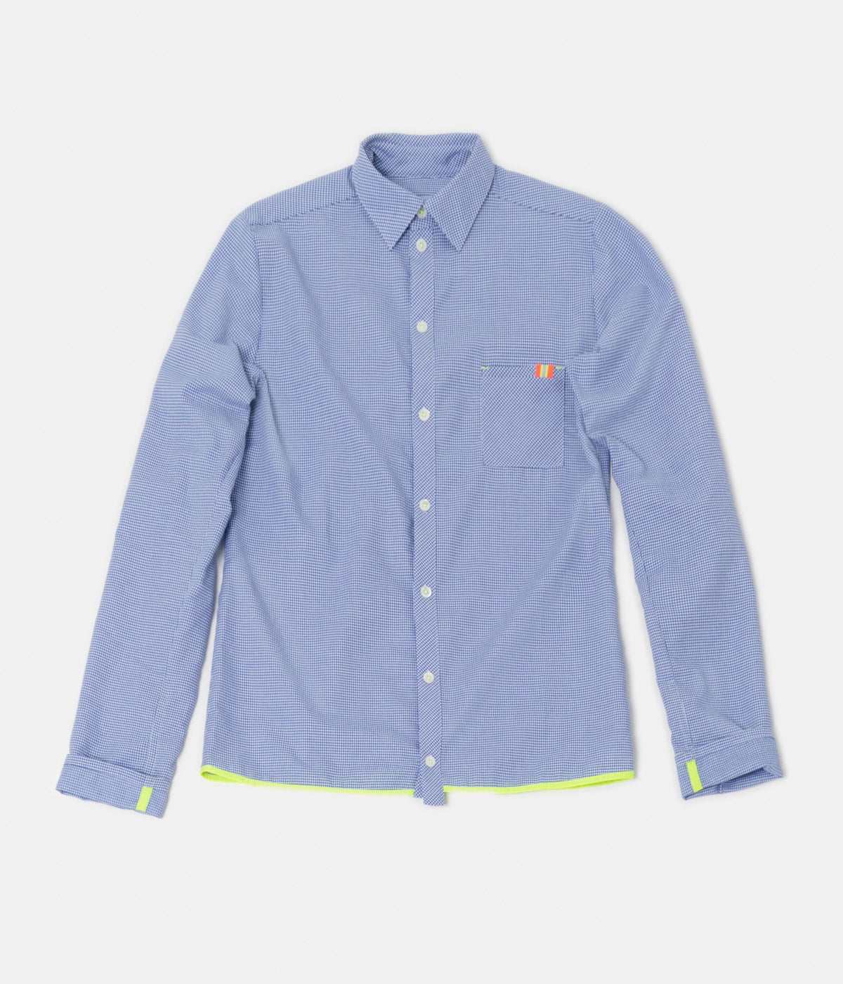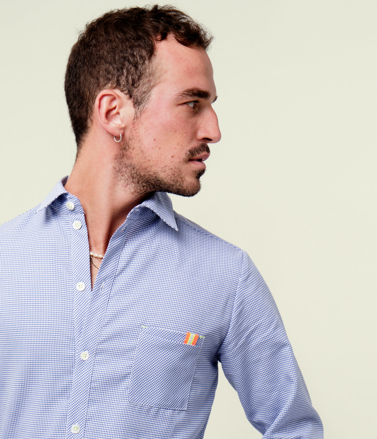 Smart-Shirt is the classic slim fitted shirt of Minuit Deux. The closing is made by 10mm pearl buttons and you gladly wear the shirt on your trouser as you have a bias at the bottom of the shirt. The shirt includes a Windsor collar and a pocket on the left side. Sleeves doesn’t have a cuff but allow you to roll it with colored ribbon detail on the inside.