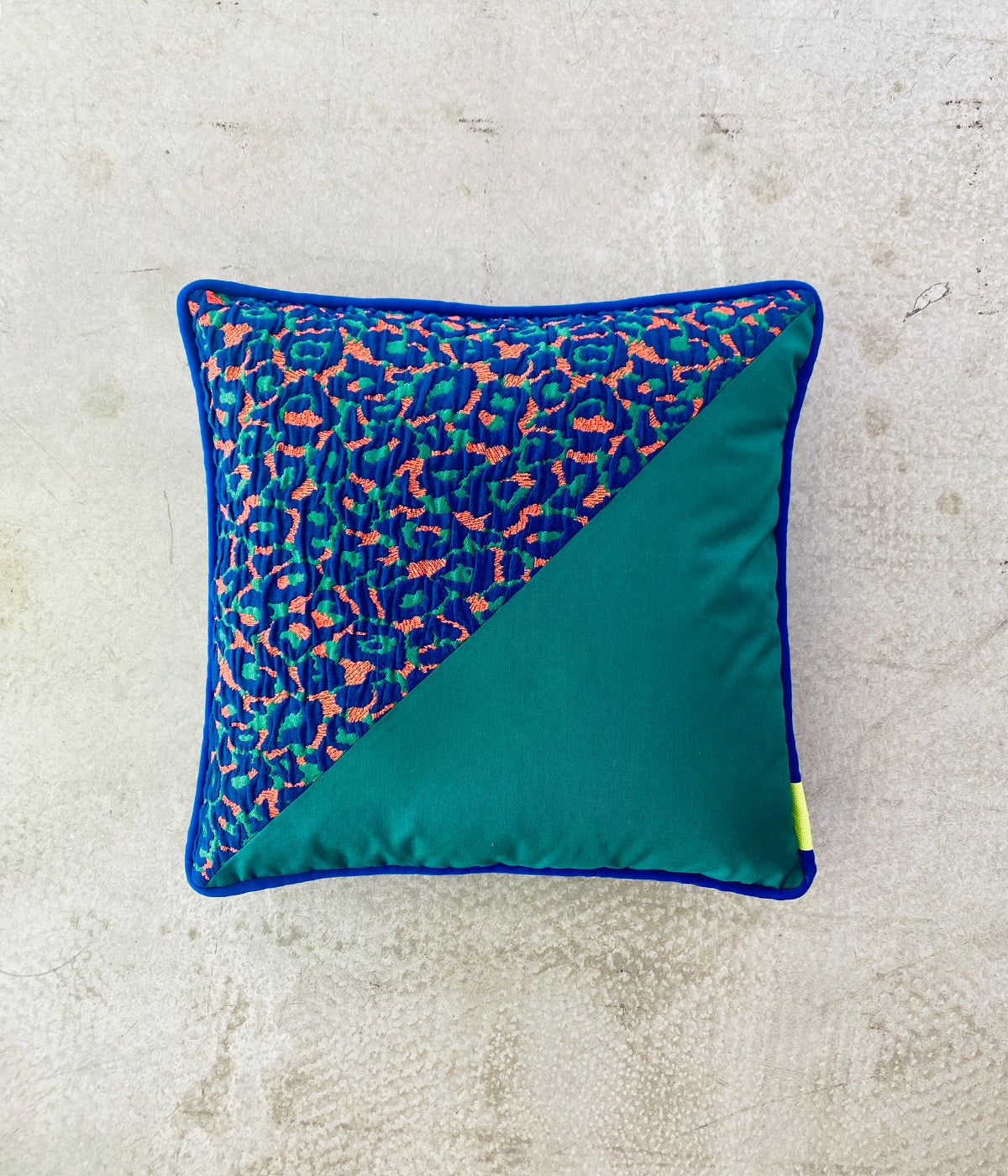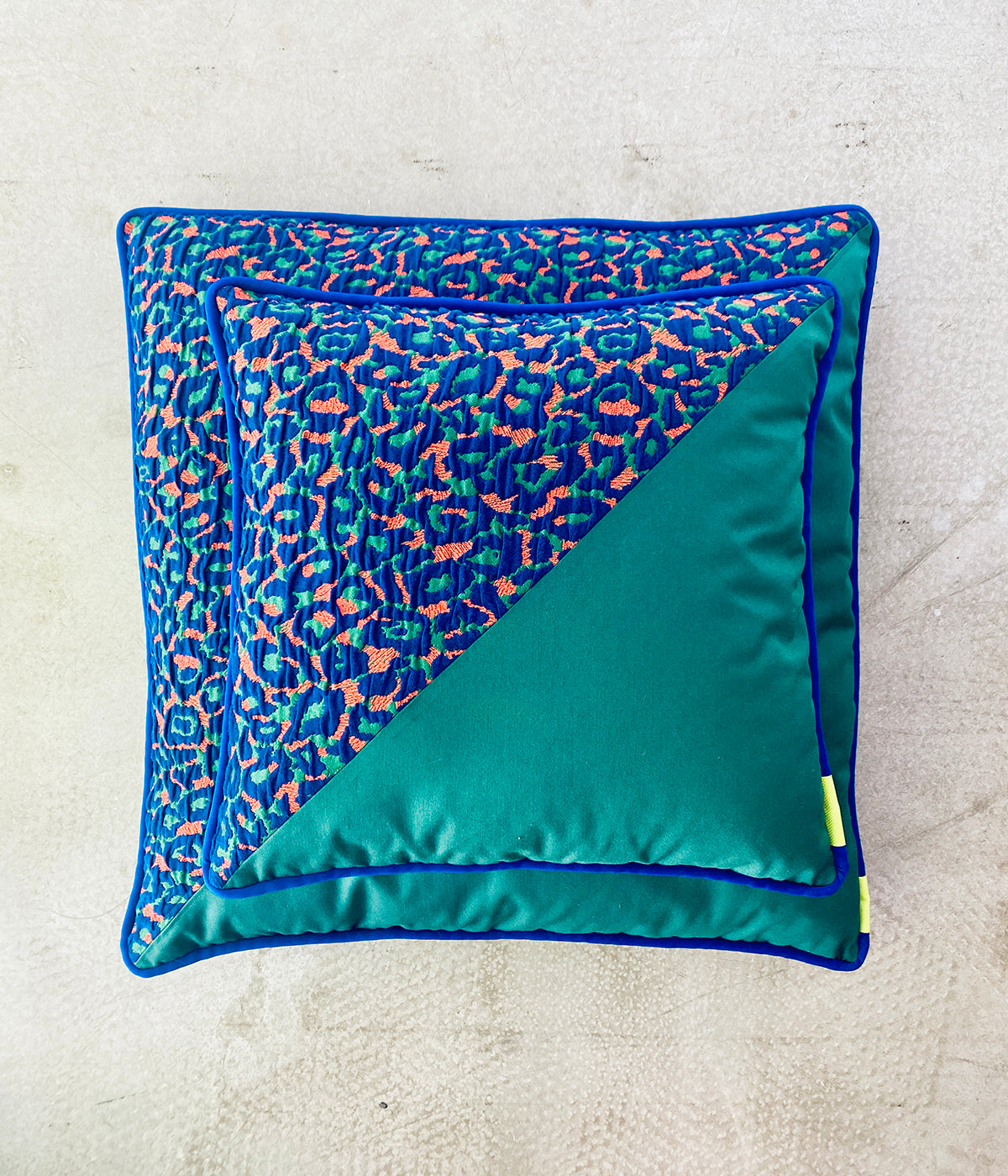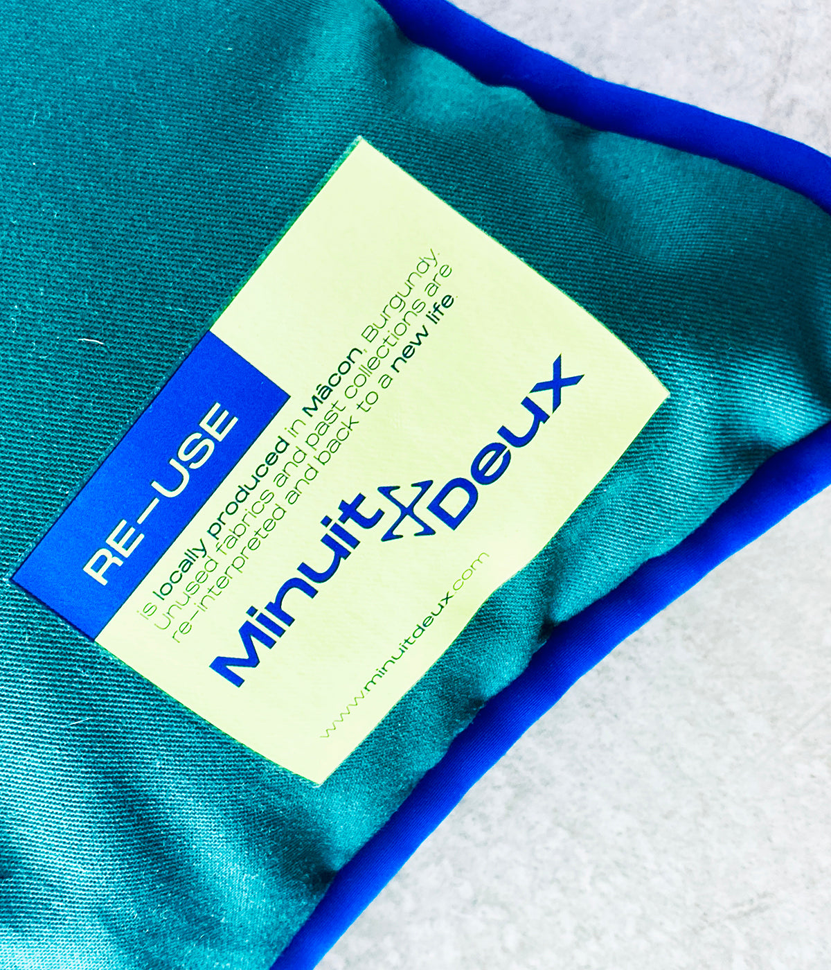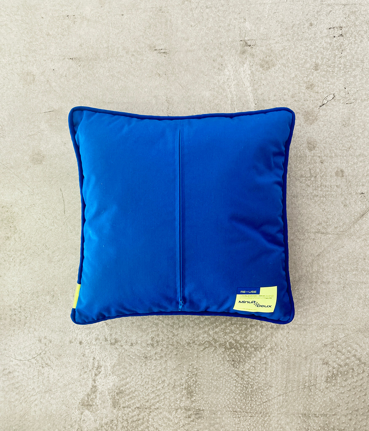 It comes in 45 and 65 cm with the cushion inside. A zip makes the cleaning very easy and the neon yellow and royal blue colors makes it a Minuit Deux special.