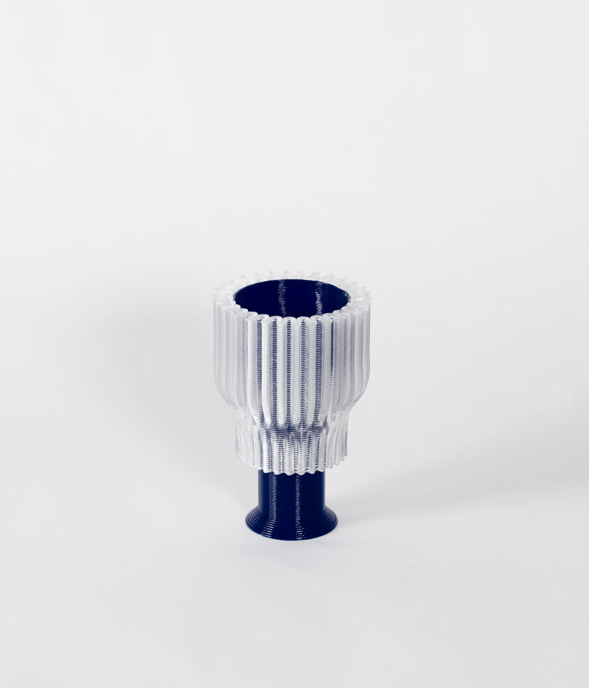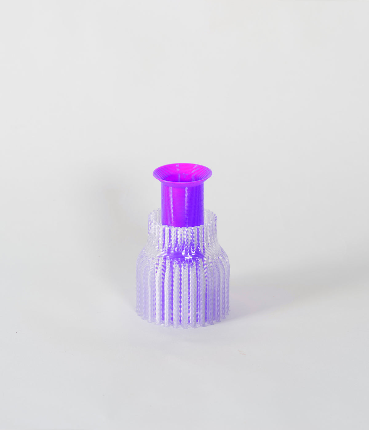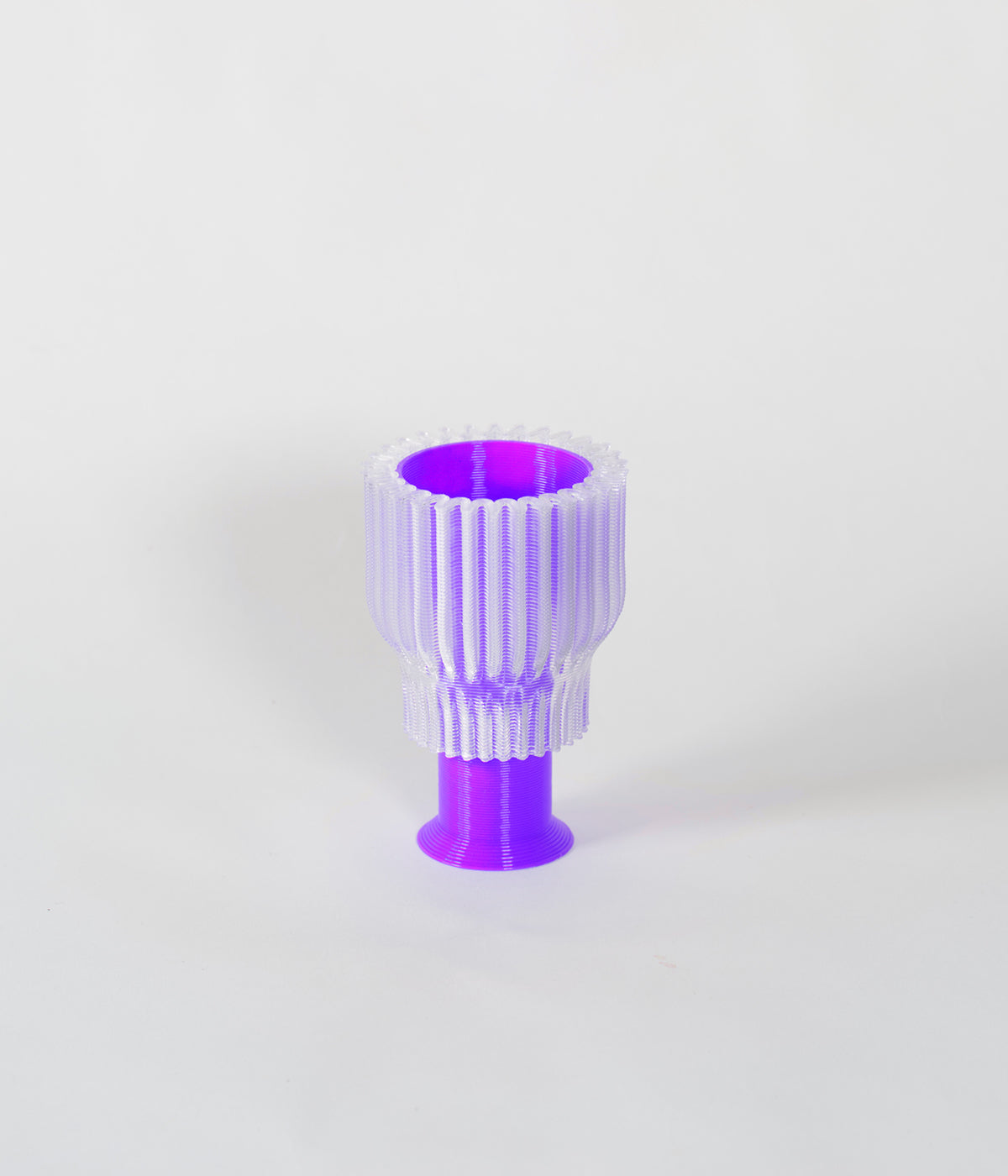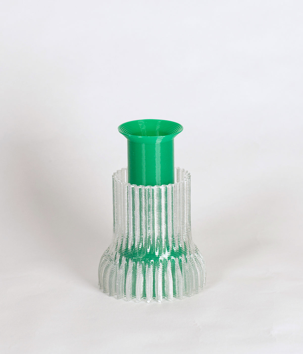 This object is made in 3D printing in our studio from recycled and recyclable plastic bottles as well as industrially compostable bioplastic made from corn starch (rPETG + PLA).