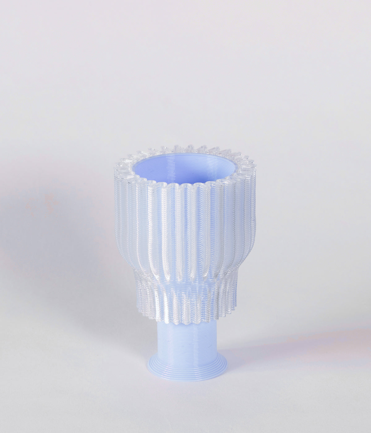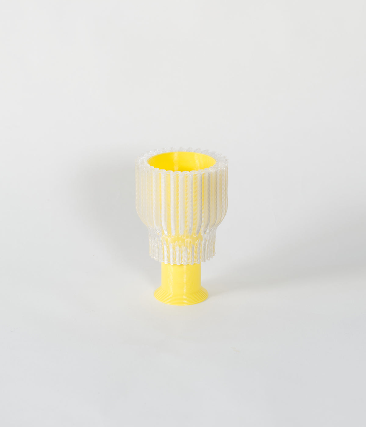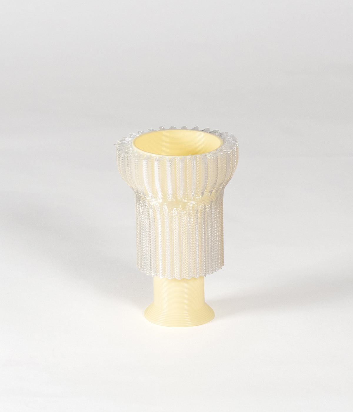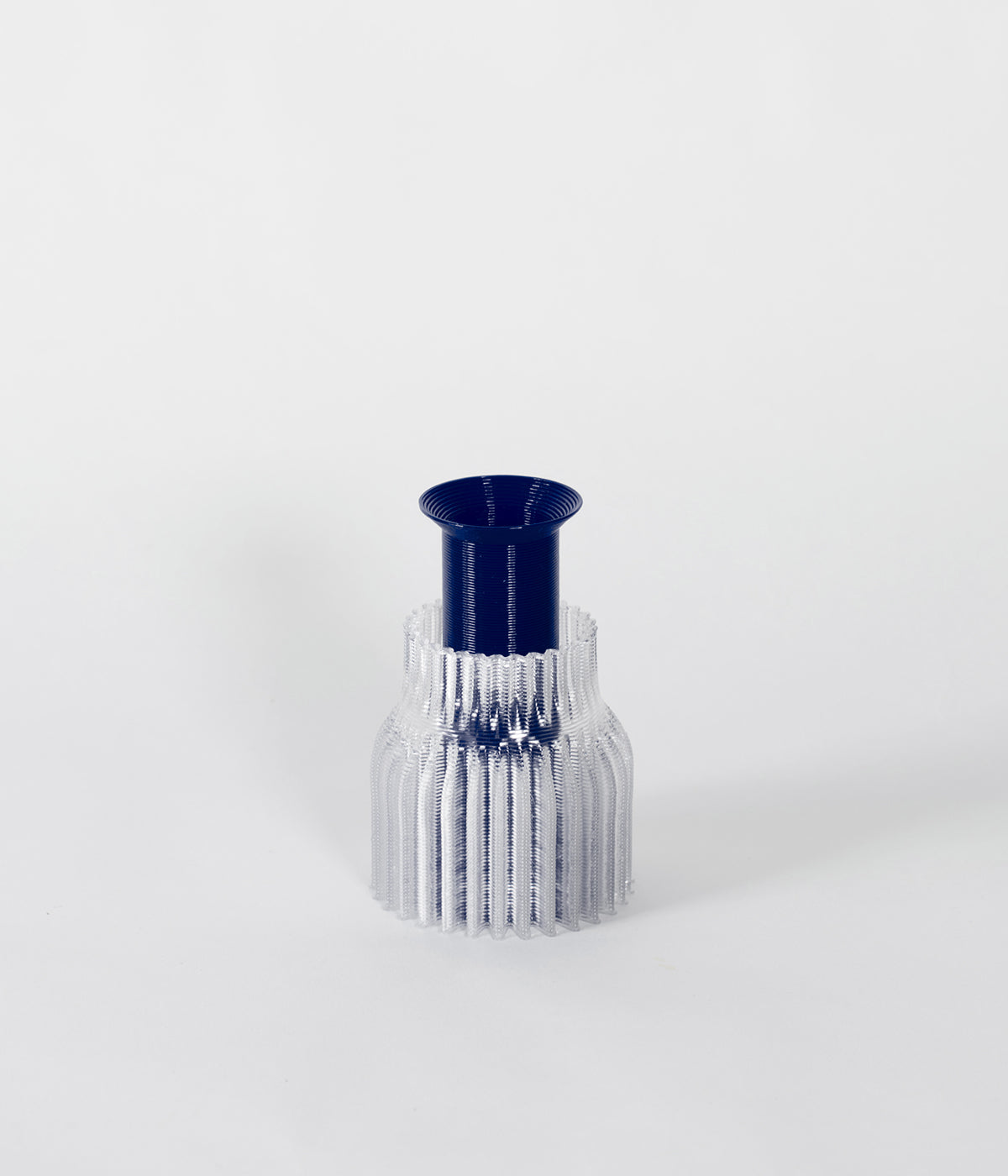 This object is made in 3D printing in our studio from recycled and recyclable plastic bottles as well as industrially compostable bioplastic made from corn starch (rPETG + PLA).