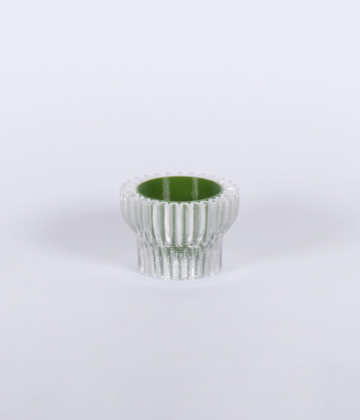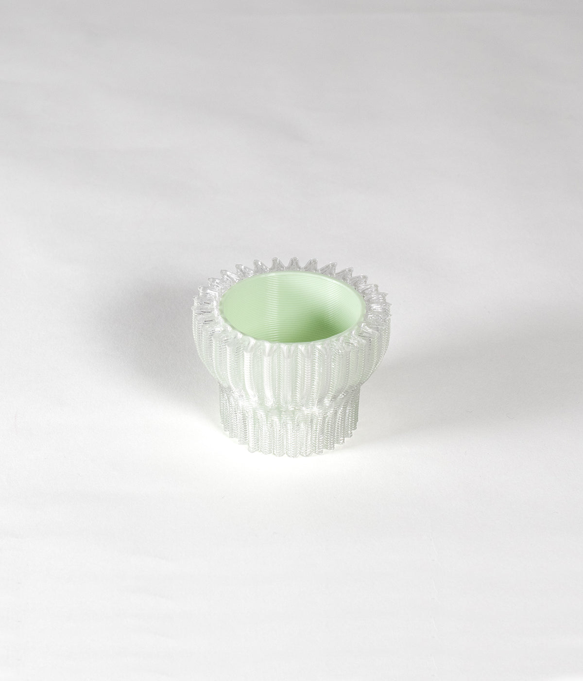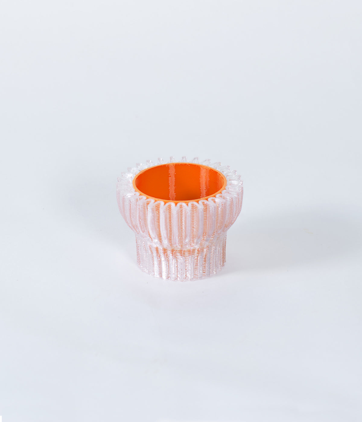 This object is made in 3D printing in our studio from recycled and recyclable plastic bottles as well as industrially compostable bioplastic made from corn starch (rPETG + PLA).