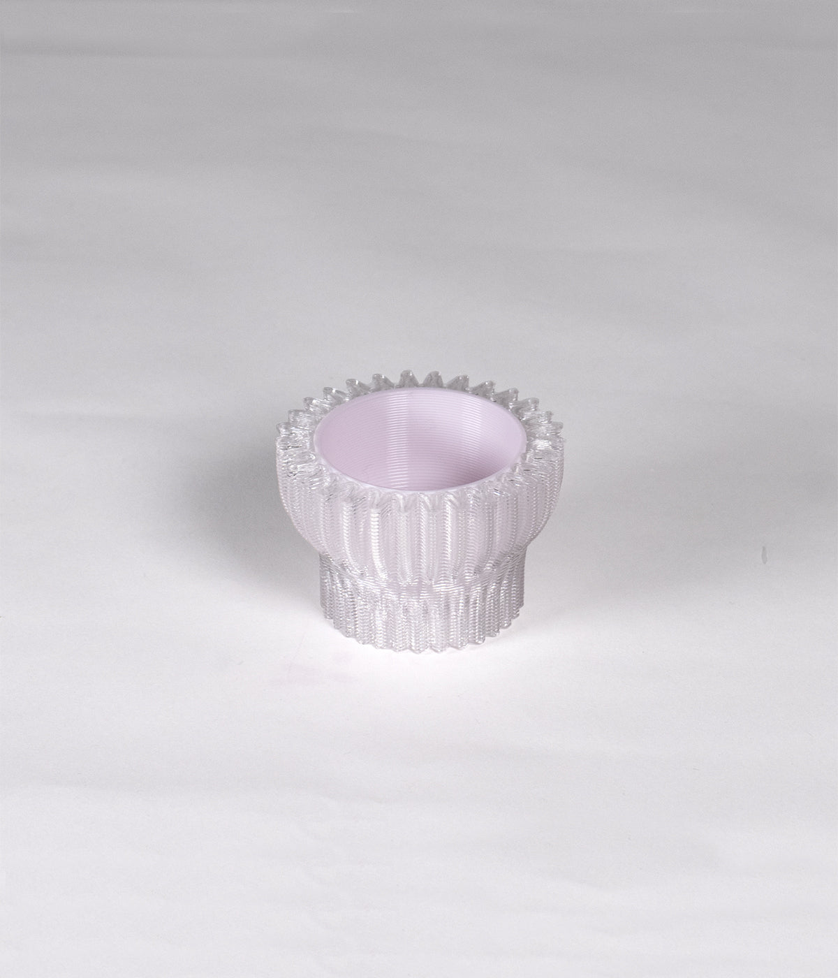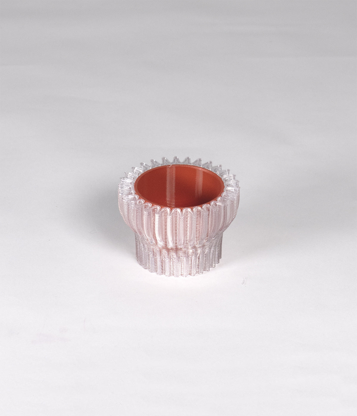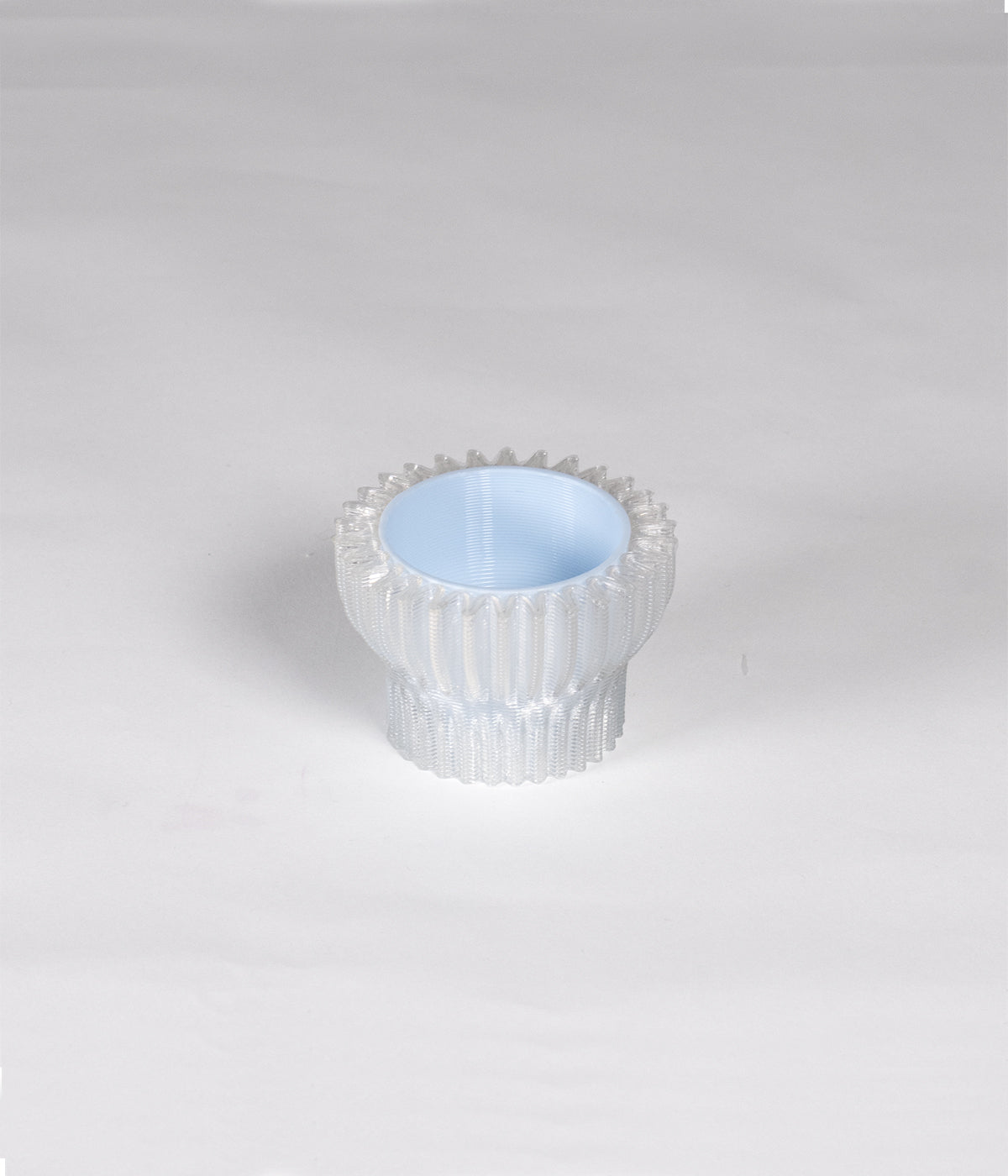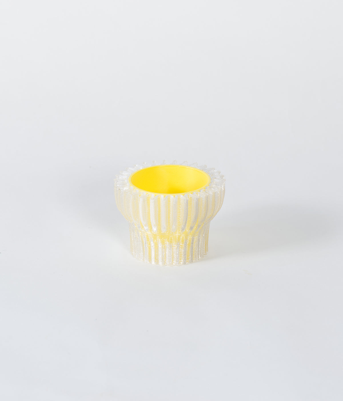 This object is made in 3D printing in our studio from recycled and recyclable plastic bottles as well as industrially compostable bioplastic made from corn starch (rPETG + PLA).