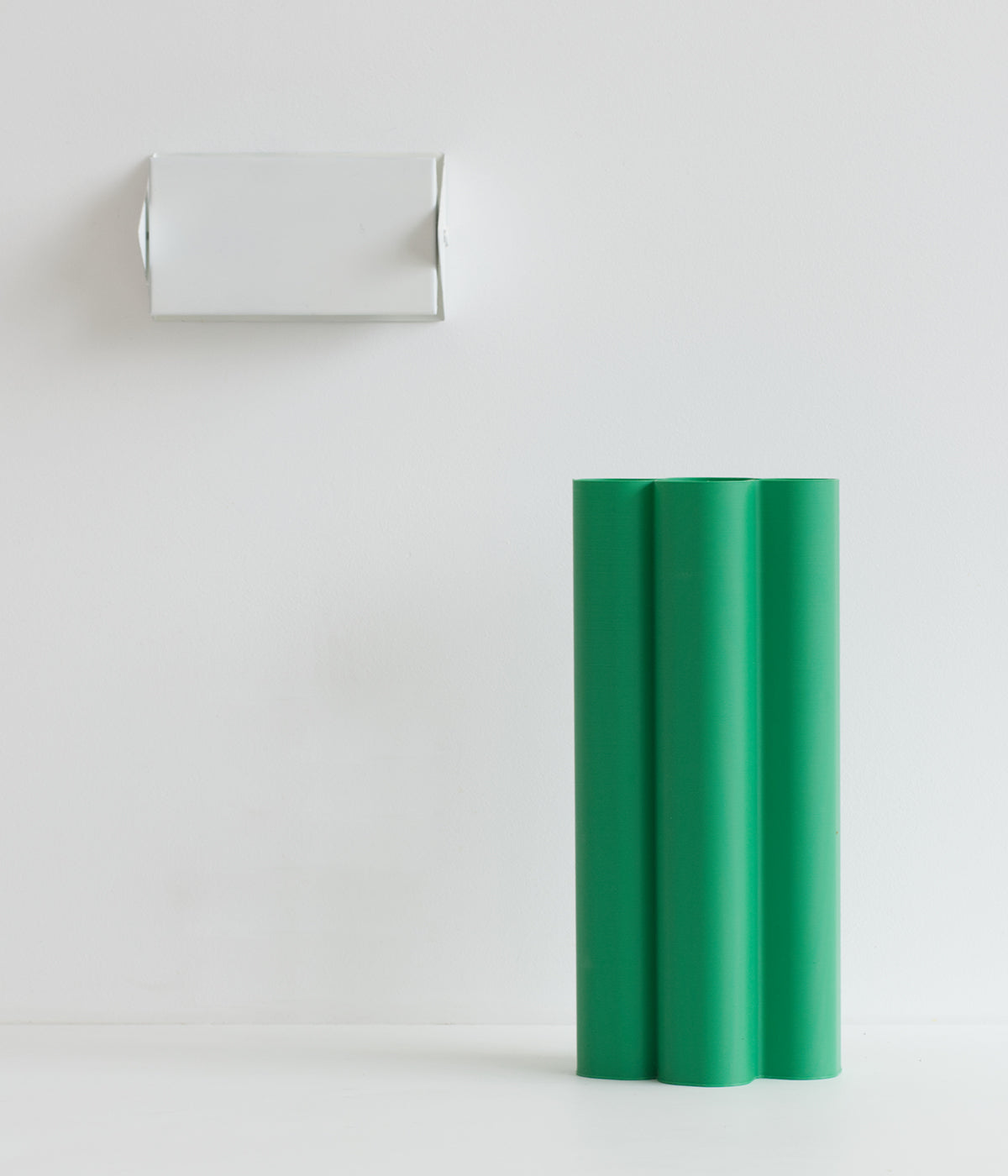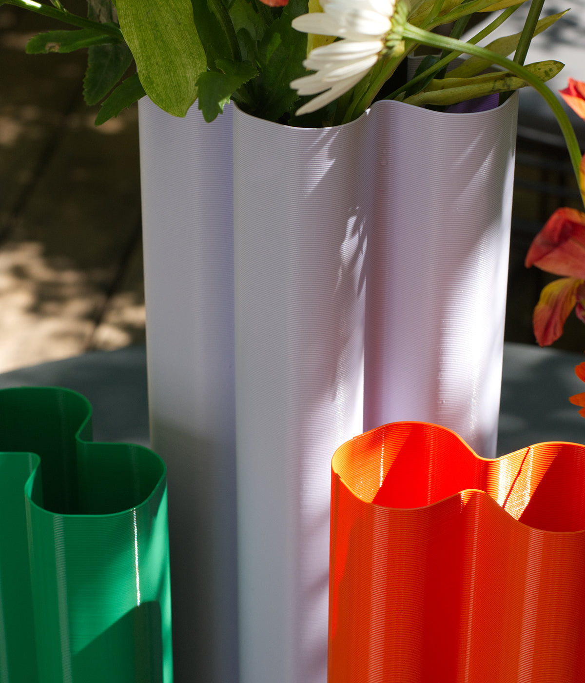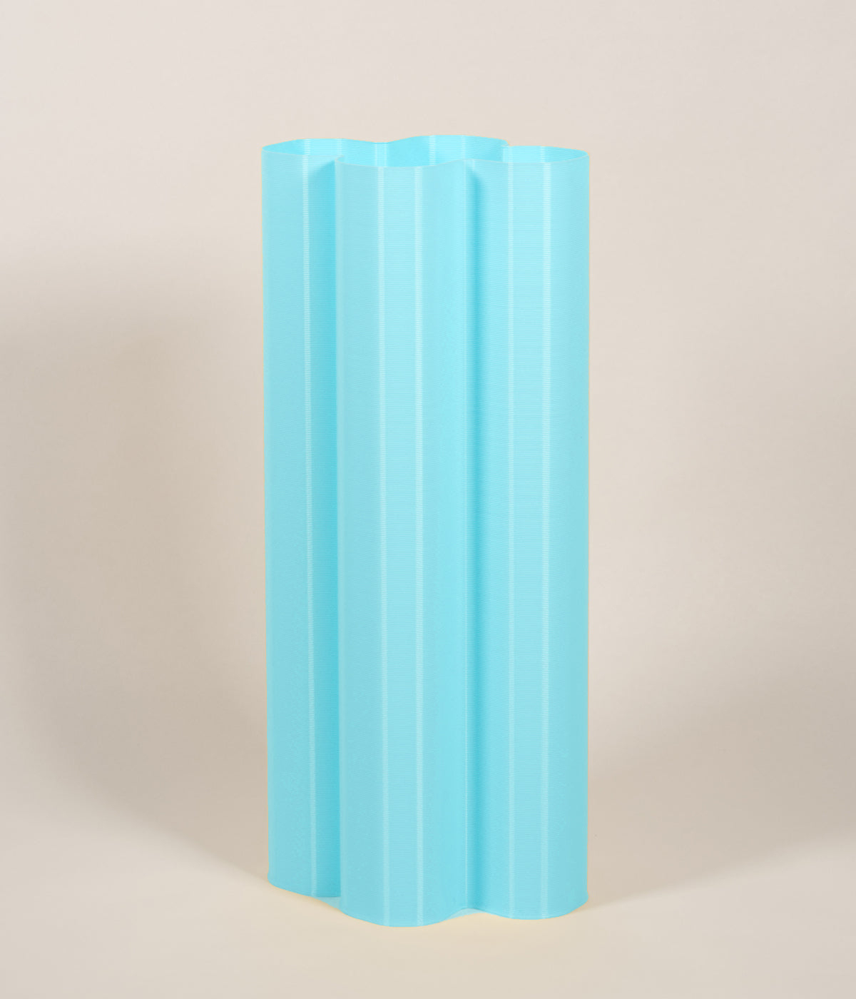 Cet objet est réalisé en impression 3D dans notre studio à partir de bouteilles en plastique recyclées et recyclables ainsi que de bioplastique compostable industriellement à base d'amidon de maïs (rPETG + PLA).