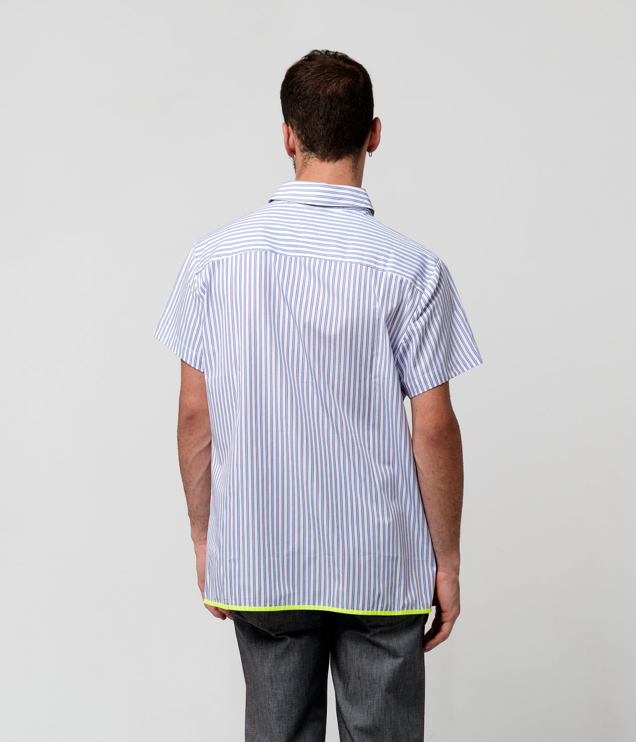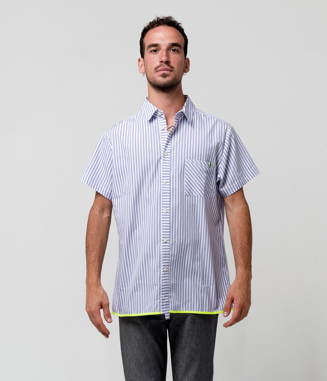 Formal-Shirt est une chemise à manches courtes avec une coupe ample. La fermeture se fait par des boutons nacrés de 10mm et on porte volontiers la chemise sur son pantalon car on a un biais en bas de chemise. La chemise comprend un col Windsor et une poche sur le côté gauche. Les manches sont joliment cousues avec 5 surpiqûres.