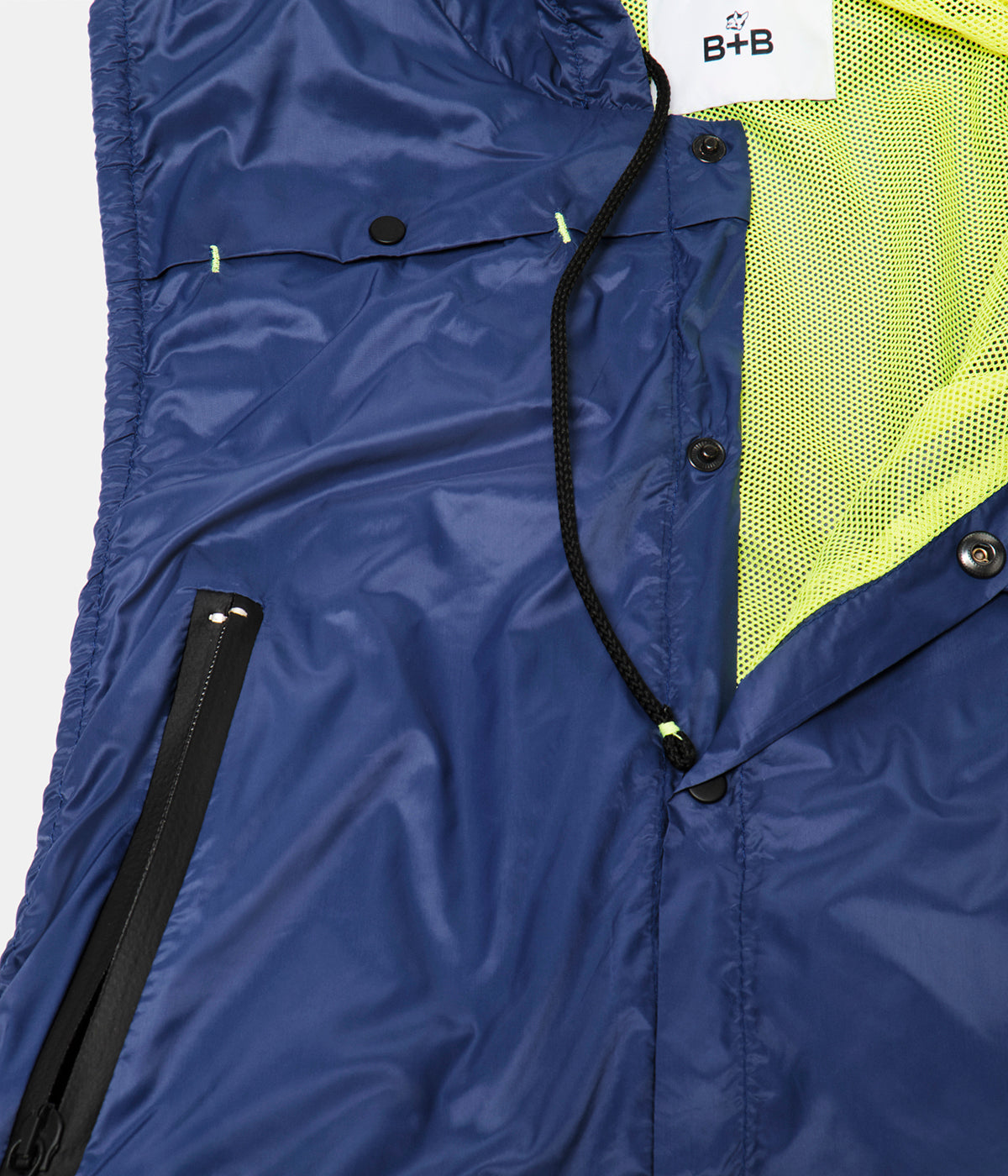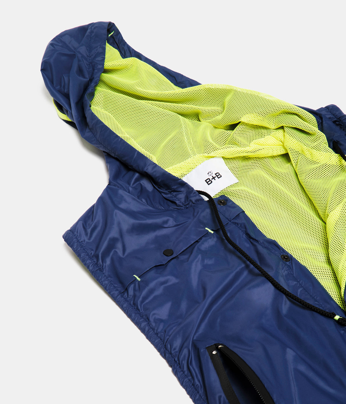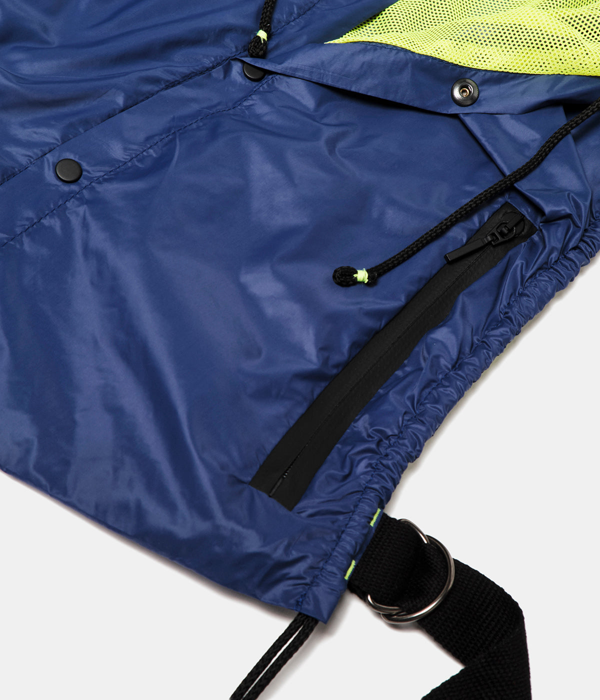 La capuche-poche est un vêtement extérieur doté de poches zippées imperméables, à porter seule ou sous un manteau. Cette pièce polyvalente est doublée d'une maille fluo et présente de nombreux détails fonctionnels, comme un cordon de serrage latéral ou un système de fermeture ajusté à la tête.