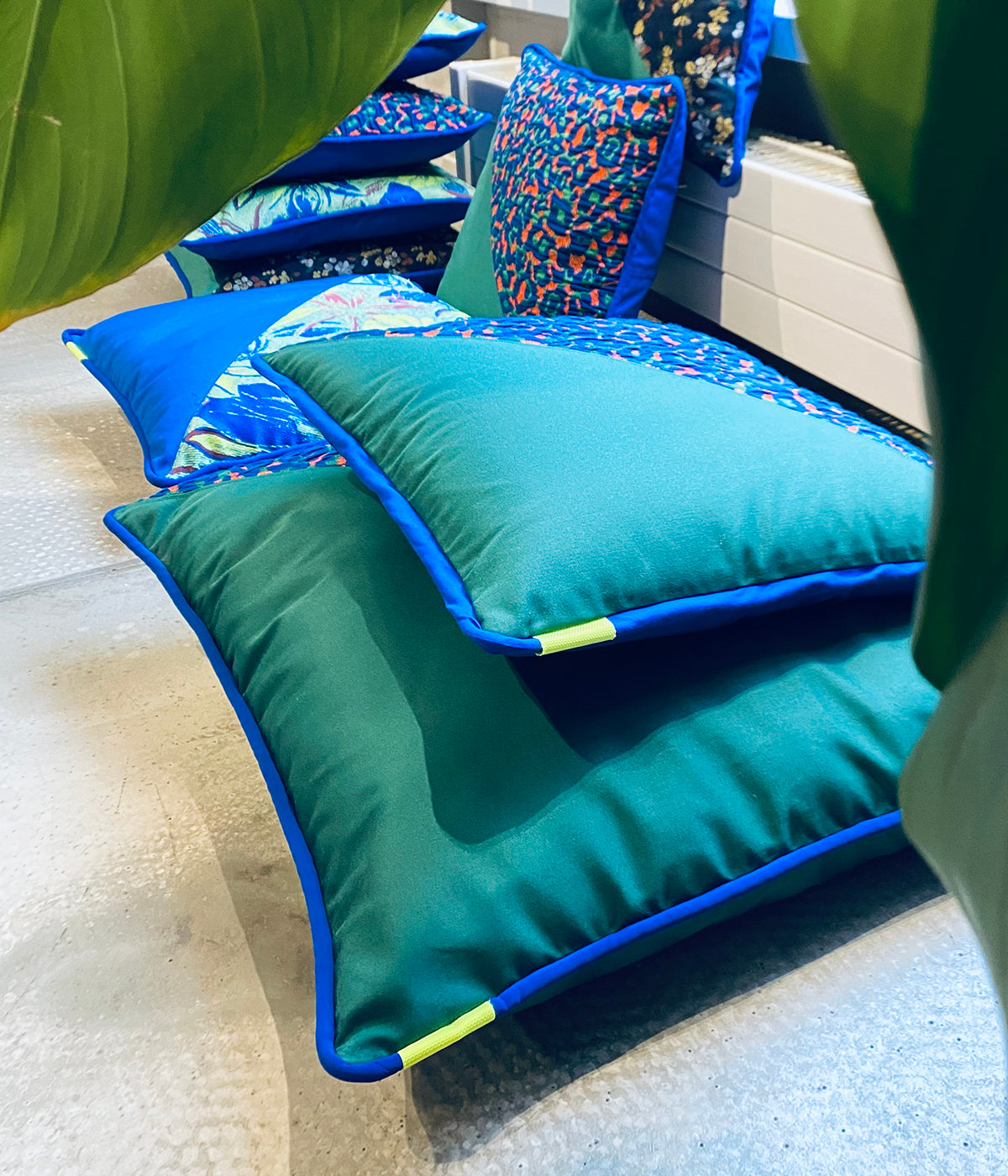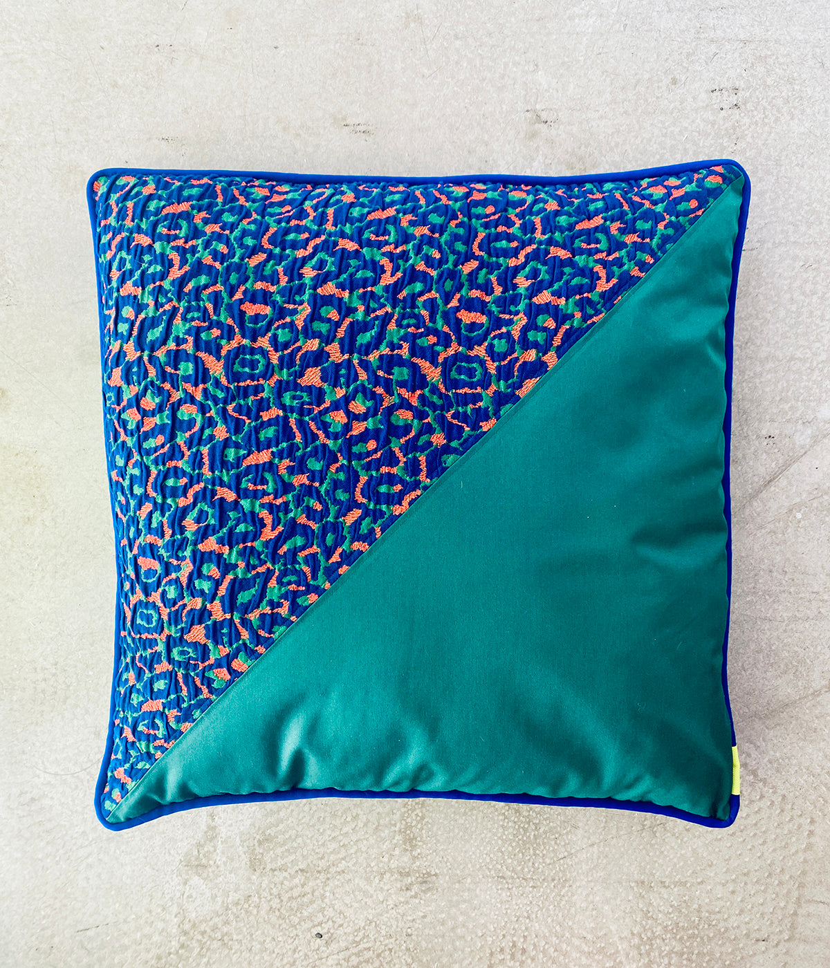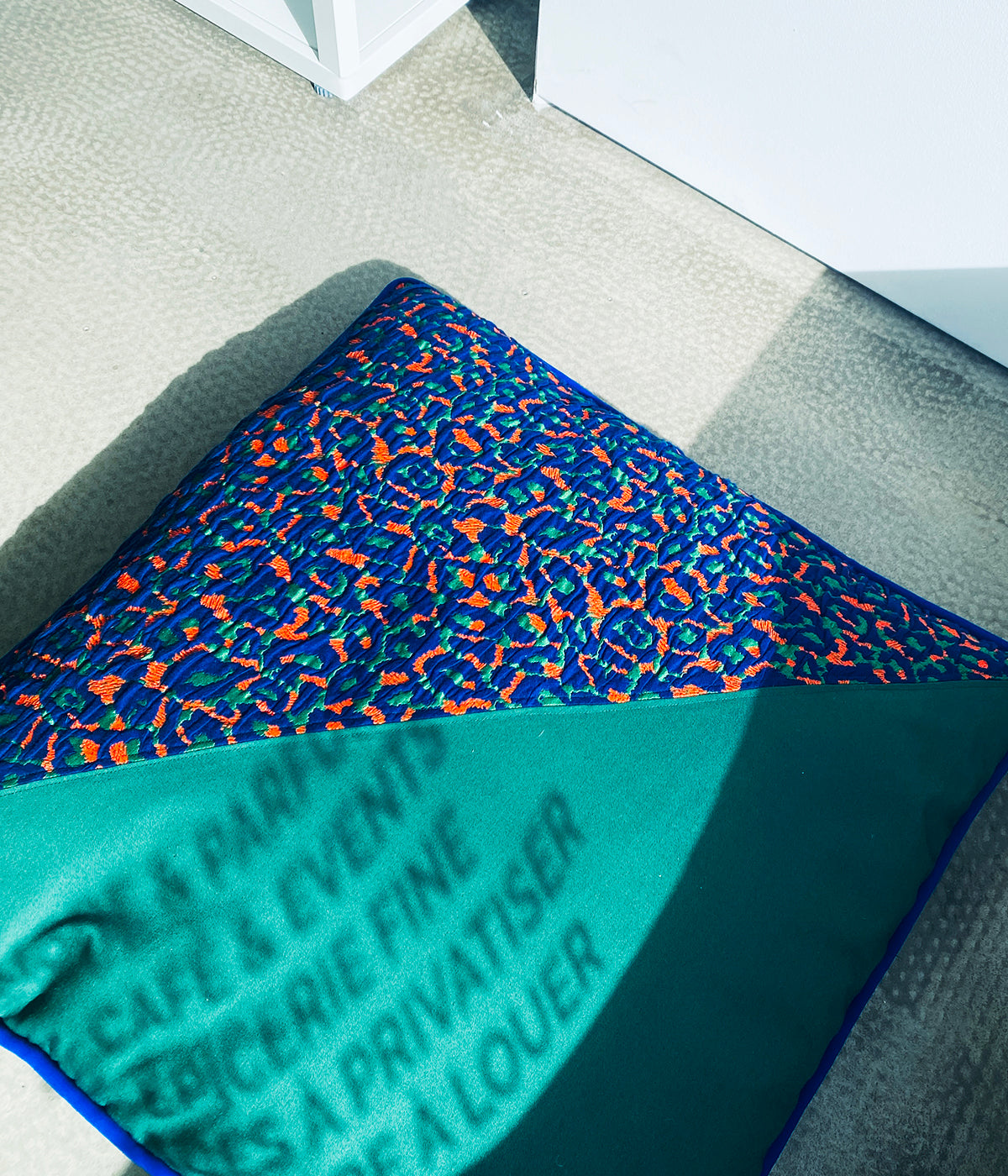 It comes in 45 and 65 cm with the cushion inside. A zip makes the cleaning very easy and the neon yellow and royal blue colors makes it a Minuit Deux special.