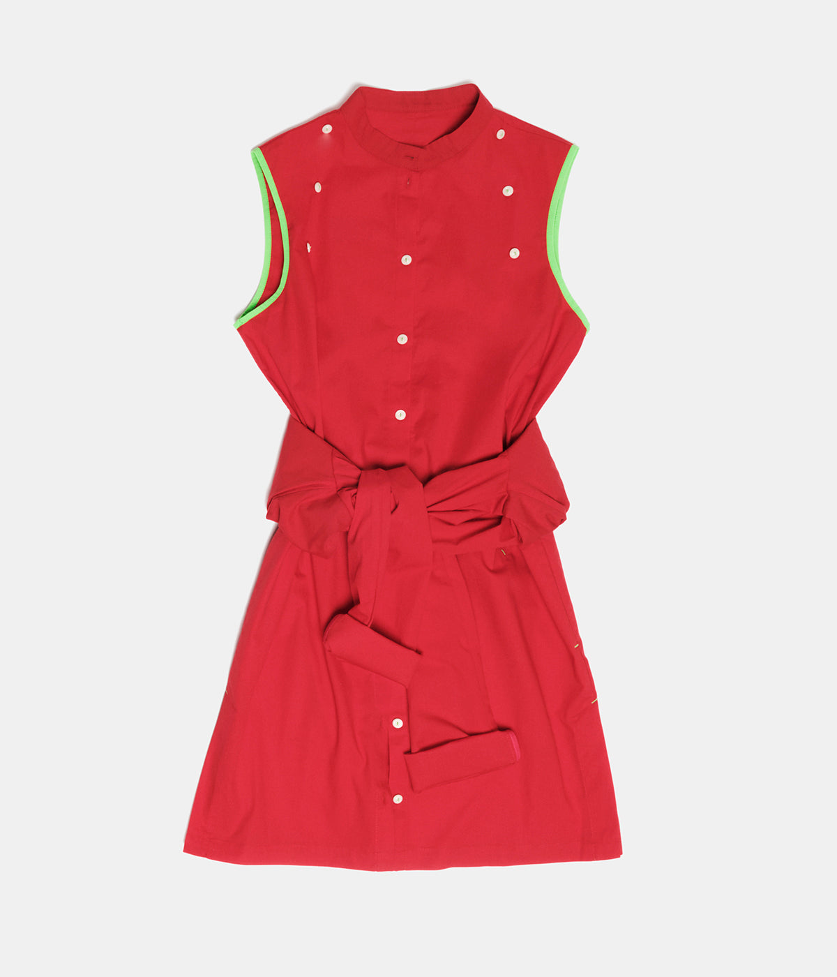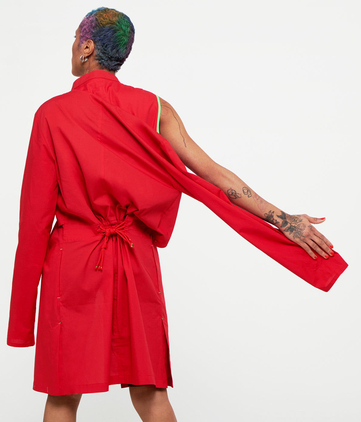 Uni-Dress is a long versatile shirt that can be used open like a long jacket or closed like a dress. It is closed by 10mm natural recycled polyester buttons fixed with a fluorescent thread. The long sleeves can be removed from the shoulder and used like a belt around the waist. It means you have 2 pieces in one!