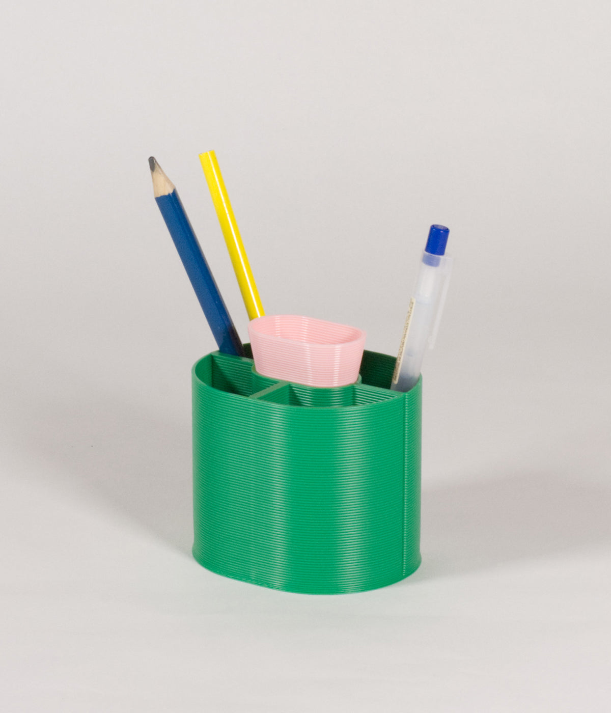 This object is made in 3D printing in our studio from recycled and recyclable plastic bottles as well as industrially compostable bioplastic made from corn starch (rPETG + PLA).